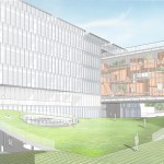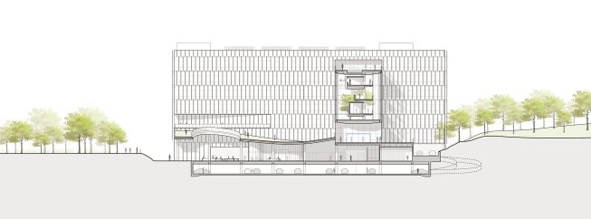 Placed on the southeast end of the campus, the building’s configuration and the outdoor spaces are designed to define the campus boundary and the green and create a community hub promoting interaction among the residents. Featured prominently on the ground floor is the community court, a semi-open shared space for the resident companies and visitors, which contains exhibition spaces, meeting rooms, a lecture hall, a cafe, and an outdoor court. Above the community court is the green roof that touches down at the corner of the pedestrian path, extending a friendly invitation onto the urban topography and giving the campus residents a rare opportunity to enjoy grass and sun within the densely built metropolitan area.