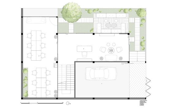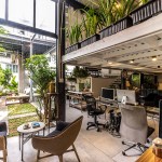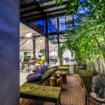 The surrounding garden – with tropical plants, curtain plants draping from the roof and the window planter boxes – brings nature inside and provides a place for rest and informal exchanges between different creatives. A roof terrace offers views to the surrounding neighbourhood and a relaxation space.