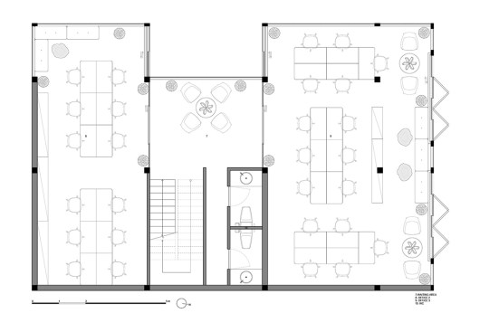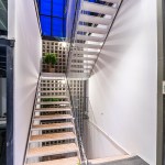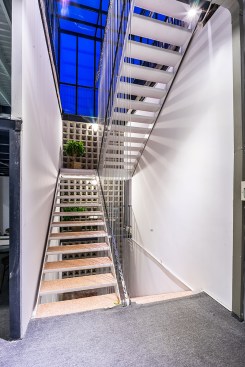 The steel creates a three-dimensional puzzle with the spaces filled according to the various and changing needs of the tenants. Double height ceilings alternate with lower mezzanines allowing for a multitude of usage of the light-filled creative space.