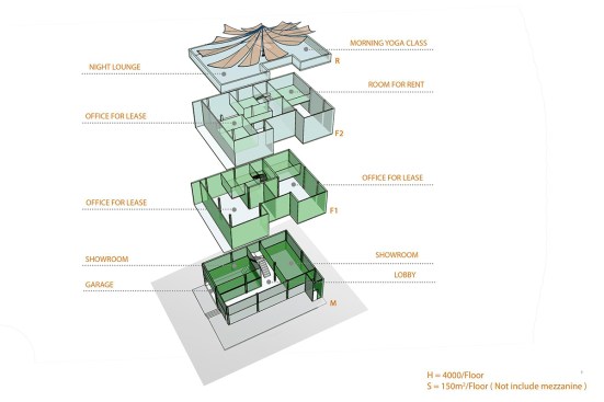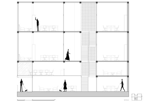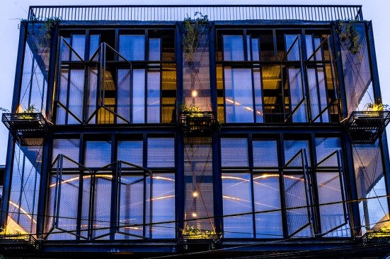 Housing coffee shop, furniture showroom, apartment and office space, as well as a roof top terrace, the steel structure and lightweight sliding and folding panel facade elements allow control of light, shade and air, blurring the boundary between inside and outside.