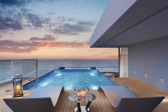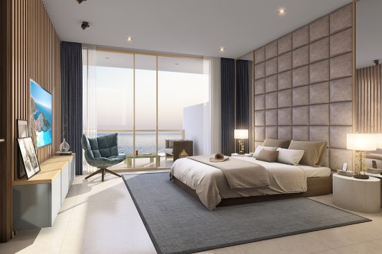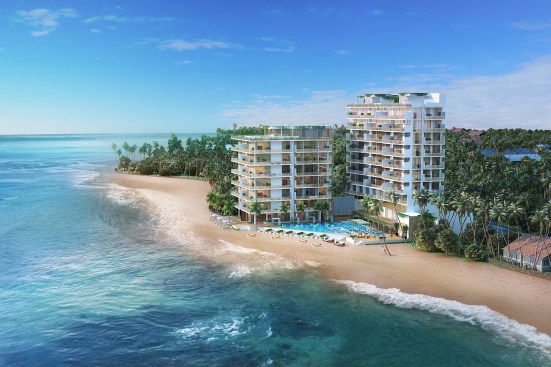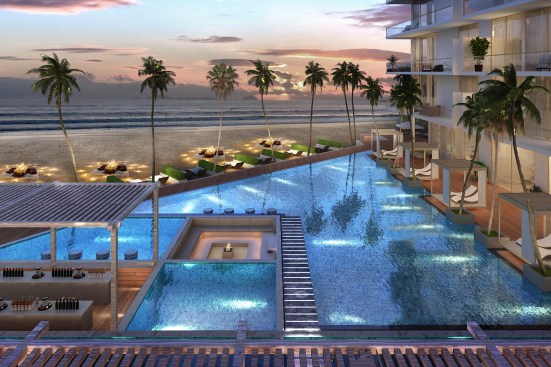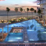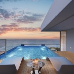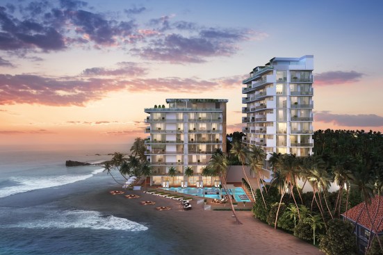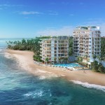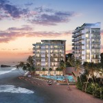 The pristine collective of luxury beachfront apartments are situated along the serene ocean waters of the southern coast. The soft waves of water that breaks against the barrier of rocks and the grove of Lankan palm trees that gently dance to the swirl of wind creates an utmost perfect setting for this dwelling. The 2 linear blocks of structures are placed perpendicular to each other, one hosting a restaurant, reception, and a champagne bar, and the other a gym, and a day care facility on the ground floors levels. The apartments are elevated above the common used spaces to provide absolute privacy and serenity to the user enhancing the high-end luxury living experience. The 47 lavish apartments are all given exceptional beachfront views from all levels with the occasional, delightful and refreshing obstacle of treetops and water features. Both the 2 and 3 bedroom apartments consists of meticulously designed living, dining and pantry spaces with the finest finishes such as solid timber flooring, satin finished walls and ceilings, champagne coloured framed glazing and warm tone lighting. The generously spaced overhung balconies are gated with use of sheer glass to maintain an unobstructed view of the surroundings. A group of garden villas and penthouses with their own spectacular features such as roof top terraces for entertaining and plunge pools for soothing are also added to the mix of apartments, giving the end buyer a grand variety of options to choose from. The interior furnishing is kept minimal with white washed furniture feel to emphasize on the stunning natural backdrop of the Indian Ocean. Lastly but certainly not the least would be the grand infinity pool and all its brilliance. From the point of entry to the surrounding perimeter of the land, the pool engulfs a majority of the ground floor level. The use of sunken lounges breaks away overwhelming sensation of the pool creating quaint relaxing spaces. The split level bar consist of land and water seating giving direct access to the bar from the pool as well as the restaurant level. Further, the decked walkway and the naturally landscaped garden provides a setting for an outdoor spa experience.
