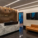 The reception, beyond being the first filter, is the meeting point for colleagues and where visitors are welcome. Black granite was selected for the floors that ends in wavy weft covered with timber adding a warm and dynamic contrast, that is broken by the monolithic presence of the reception covered in white Carrara marble.