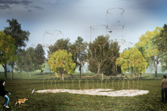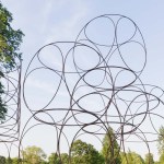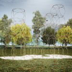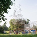The Summer House is a space-chain construction of 4+1 levels. It is composed of cubes defined by 6 circles of 1.85 metre in diameter and made with steel tubes of 16 mm in diameter. The cubes are composed into irregular geometrical shapes that rest on the ground.