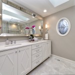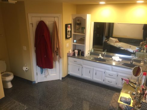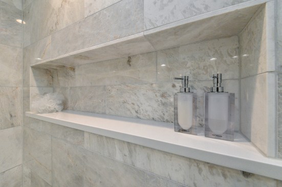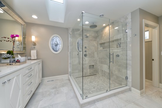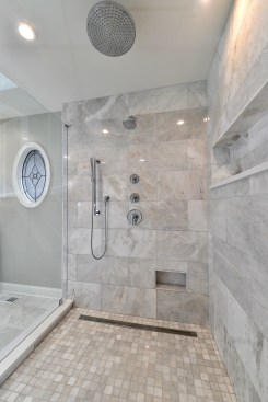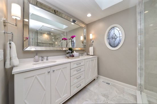 The client wanted to update the entire master bedroom suite, which included the walk-in closet and bathroom. The husband's main focus was in the master bathroom and his wish list items were getting the largest marble tiled walk-in shower he could, along with a dedicated enclosed water closet room. The wife wanted to enlarge the walk-in closet and to create a vanity that looked more like a piece of furniture. We held a "design contest" of sorts, as to the overall master bathroom layout, since the husband wanted to try his hand at designing as well. So it made the process a lot more fun & creative, plus, it got the couple involved. They ended up choosing one of our designs, and in the end, they were the real winners…since they now have such a fantastic space! I think if it was up to the husband, the whole bathroom would have been a walk-in shower, so managing his expectations became a challenge. We certainly did not want to disappoint him or squash his dreams, so we took extra time to show him examples of past projects, marking the overall size before demo and showing him how we were squeezing every inch possible out of the space. From a construction stand point, we moved the toilet and shower to the opposite side of the room. We had to re-configure the entire plumbing system including drains, vents & water supplies. Part of the master bath was located over the garage which helped make it easier to figure out the layout of the drains and vents, however we now needed to build soffits in the garage ceiling and install a massive amount insulation which added to the cost of the project. The wife wanted a vanity cabinet that was not a "standard" item offered through the cabinet company. She wanted something that looked more like a piece of furniture. So after applying as many cabinet construction modifications as possible, the rest was custom built by our carpenter on site to create a truly unique vanity cabinet for the space. The wife's last request was a larger walk-in closet. We removed the wall that separated the closet from a sitting area and then built a new wall to section off the entire space from the actual bedroom area. This required moving electrical and some HVAC vents. In design, sometimes it's the little things that make the difference. We added functionality to the vanity cabinetry with adding roll-out trays at the bottom of each sink base cabinet and also added dividers to the drawers for make-up and toiletry items. Some additional things were adding a skylight for more natural light, adding a toe niche in the shower for shaving purposes; and most importantly for the wife, we doubled the available hanging space within the walk-in closet. We also added a door between the master bath & new master closet allowing the early morning riser to get ready without disturbing his partner. The natural marble throughout the entire shower is light, luxurious, and timeless, which sets the stage for the rest of the bedroom's furnishings. The clients' are thrilled to be back into a true master suite, which was designed for a King & Queen.