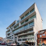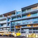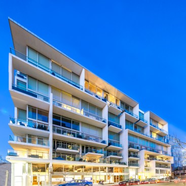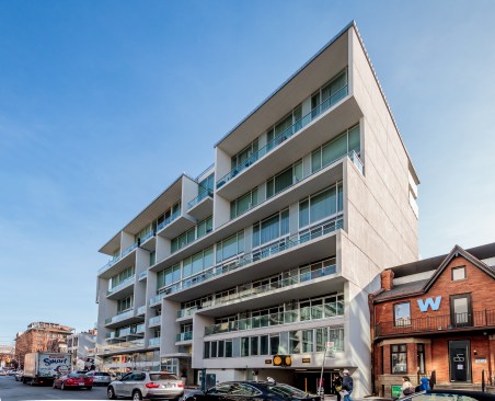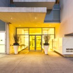 Seventy5 Portland was complete in January 2011 and is an innovative modern jewel embracing the indigenous culture of this lively Toronto neighbourhood. The developer wanted to create a unique statement with the building facade, which formed an anchor to the terminus of the street. The design distinguishes itself with its lively facade and glass-fronted, cantilevered balconies suspended intimately over the street. The building exterior features smooth concrete together with clear glazing in anodized aluminium frames. The building site plan was designed in a unique U-shape that embraces a serene courtyard and complements the Portland streetscape. The eleven storey structure is characterized by massed elements that shift in and out. This is accentuated by soaring 18’ concrete ceilings in two storey units, floor-to-ceiling glass, generous balconies and terraces, which give the structure a bold dramatic presence and allow for an open-air lifestyle in a bustling setting. The projecting concrete fins also serve to frame neighbourhood views and give the exterior balconies a sense of enclosure. A flash of yellow, the only concession to colour, is emblazoned over the front entrance and repeated again within the front entrance hall. Concrete was the perfect material to express the complexity of the façade of our project. We needed a material that would be both structural and architectural while at the same time lending an elegance to the composition.