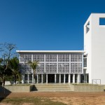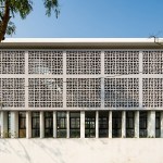 Being a coastal area the mosque is designed on a raised platform with a frontal plaza used for additional prayer space and social activity. The main hall is open and transparent for that natural light and cross ventilation is ensured. The windows flood the space with daylight. Outside family graveyard and inner prayer hall both create a spiritual bench line between present life and after world. Repetitive vertical walls act as fin which cut the glair while jail (perforated) wall filters light and creates a beautiful texture of light and shadows. The geometric pattern of jail (perforated) wall is created with continuous flipping of the custom made R.C.C. blocks. A single block is designed with five arms around a pentagon with another five holes, which reflect the magnificent number ‘five’ in Islam. Five pillars of Islam, five times prayer in a day and five Kalimas.