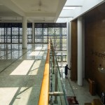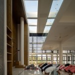 A double height volume with glass roof is created at the area for Imam and mihrab which visually connect the upper level with the lower. Mihrab is decorated with wooden veneer panel with book shelf creates an additional focus. This double height space with glass roof invites sky and rain and creates a sense in the middle of the limit and infinite.
