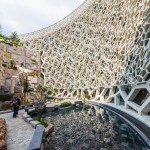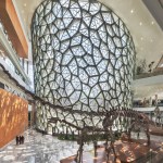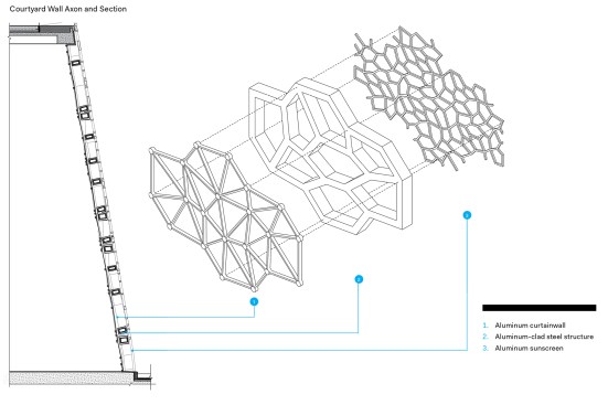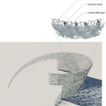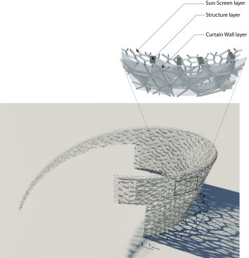 The Cell Wall is the iconic feature of the Shanghai Natural History Museum, and is the main design feature from the initial competition phase. Composed of three layers, each with its own unique geometrical pattern and organic form, the wall is organized in an elliptical cone shape envelope. At the core is the main layer, the structural cell layer, which emphasizes the organic cells as structural building blocks of nature. An inner layer, the waterproof envelope of the building, is formed by the glass and aluminum mullion curtain-wall, and an outer layer provides a solar screen, emulating the cellular building block of all life forms.