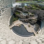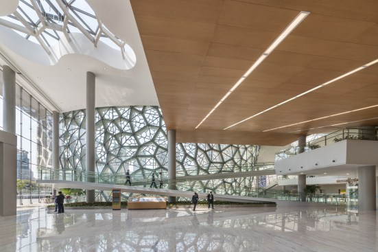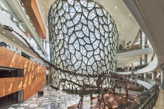 Located in the heart of Shanghai, this building asks us to contemplate our relationship to nature—as a natural history museum should. Its nautilus-shaped core, representing one of the most efficient forms in nature, enables people to spiral up from the surrounding park onto the building’s extensive green roof, into the museum under its corner entry canopy, and down into a courtyard and light well, whose meandering stairs and irregular pools recall Chinese water gardens. The courtyard’s curving glass wall follows the spiral up, down, and around, shaded by a screen whose fractured pattern echoes the cracked-ice pattern of traditional latticework as well as biological cells.