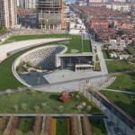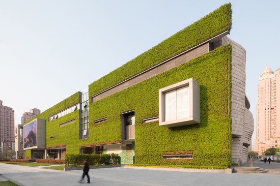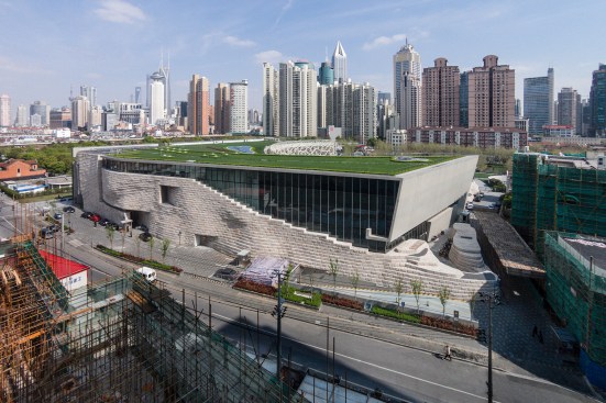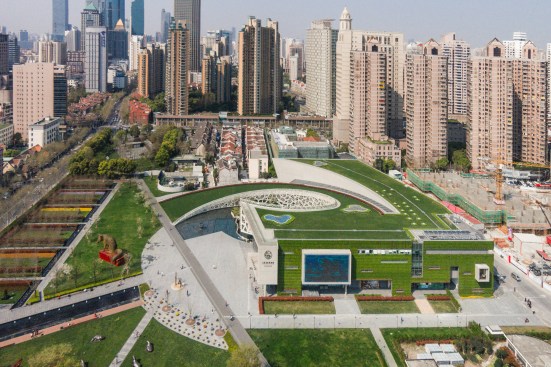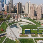 From the park to the east, visitors see a vertical, planted wall with cutouts for windows and signage; the museum faces the street to the north with an undulating, geological masonry wall that recalls sedimentation and erosion. From the nearby residential towers, the rectilinear and curving form of the museum’s green roof repeats the patterns of the pathways in the neighboring Jing’an Sculpture Park.