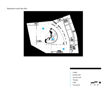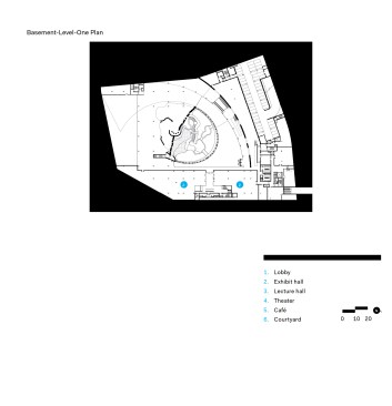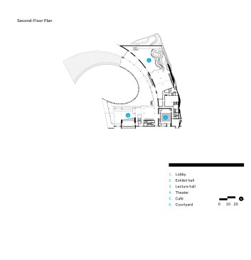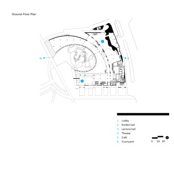 Although much of the museum stands below grade, the spiraling light well illuminates an indoor atrium and the circulation that surrounds it. Skylights over the curving central spine through the building bring daylight deep inside, ensuring that the exhibits about nature never seem far from the natural world. And as in nature, this building handles functional complexity with simplicity and clarity, showing an evolved design mind at work.