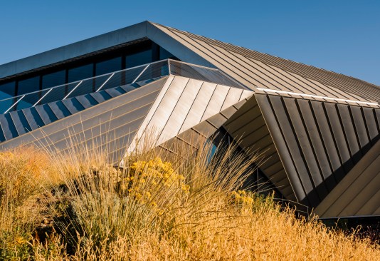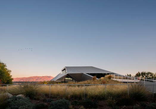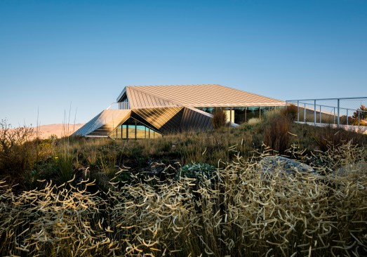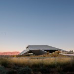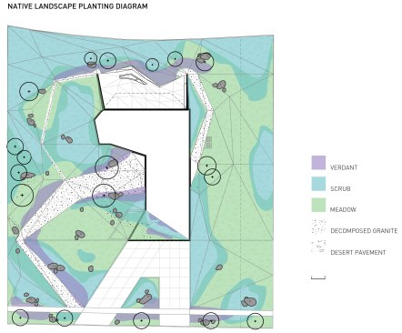 The landscape is populated by native plants – grasses, desert scrub and wildflowers. The desert begins to reassert itself within the city – maybe it will spread. Historically, landscape form has been allowed to be more relaxed than architecture, but in this case landscape informs the architecture to the point that the two are inextricable: another desert mirage.
