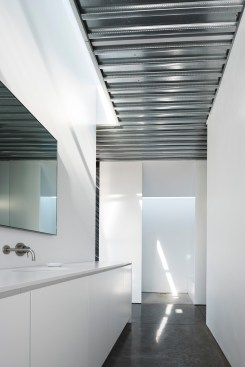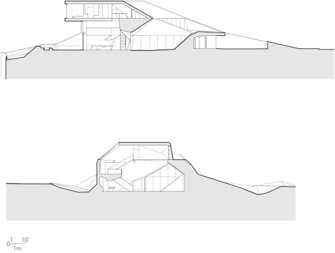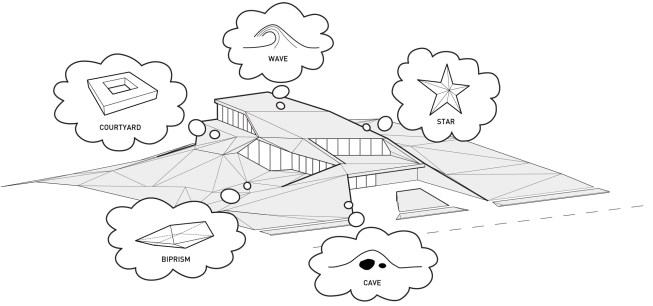 Shapeshifter explores slippery form by seeing the ground as a mutable, protean material, an untapped unconscious. Inspired by desert topography, we reshaped the site into anticlines and synclines, dunes and blowouts, and gradually the form of the house emerged with the terrain. Then we hardened what was initially conceived of as a soft form into a regular mesh composed of planar faces. Every edge is entirely shared: no edges terminate in the middle of another edge. This results in a flow of space that supports extreme difference without discontinuities. Elements of the house slide into each other with shifting relationships of fractured symmetries, local axes, and embedded parallelisms. Topologically, the house is spatially slippery, a twisted torus with several secondary and tertiary bubbles of space.