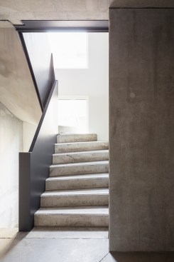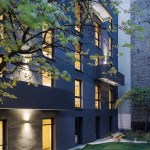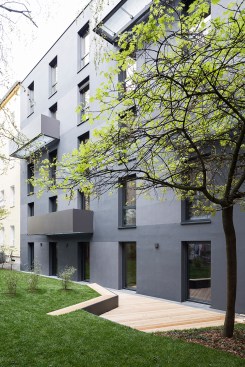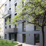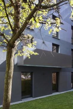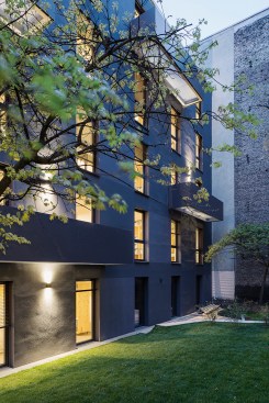 The compact, five-story building stands as a courtyard building in a typical Berlin block. It is oriented, in building depth and cubature, on the adjoining neighboring buildings, but projects out from the existing buildings through its modern façade-design made of anthracite-colored plaster, floor-length windows, and metal balconies interconnecting pairs of residential units.