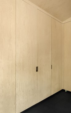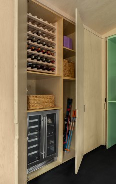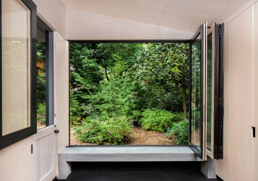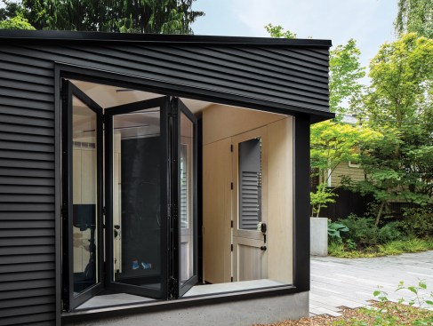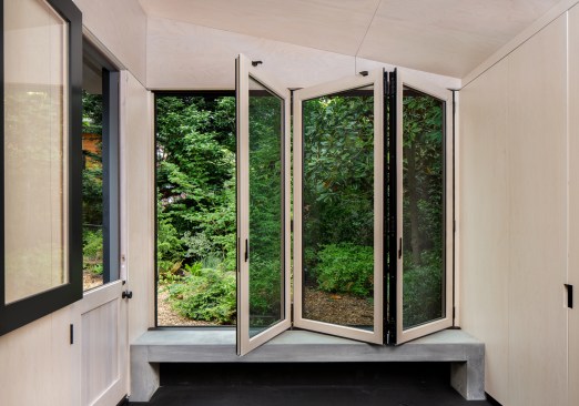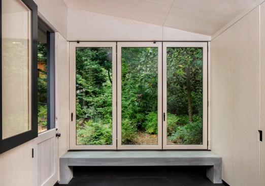 The contemporary aesthetic recalls the design elements from the primary house renovation, with each design decision carefully considered for function, multi-use, and comfort. Best Practice incorporated a large accordion glass door with a concrete bench seat to provide abundant natural light and connect the studio to the surrounding landscape. Wood-paneled cabinets expertly organize and conceal equipment while also creating a pleasant and clutter-free environment for both work and respite.