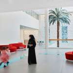 In Abu Dhabi, water is a limited resource. With blue ceramic waterways integrated in the floors, the design activates the narrative of how life-giving water has changed the rugged landscapes and created growth.