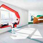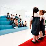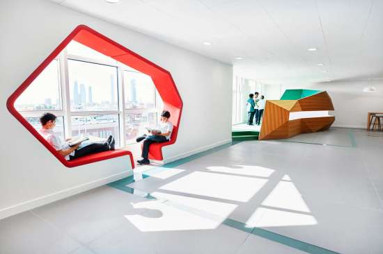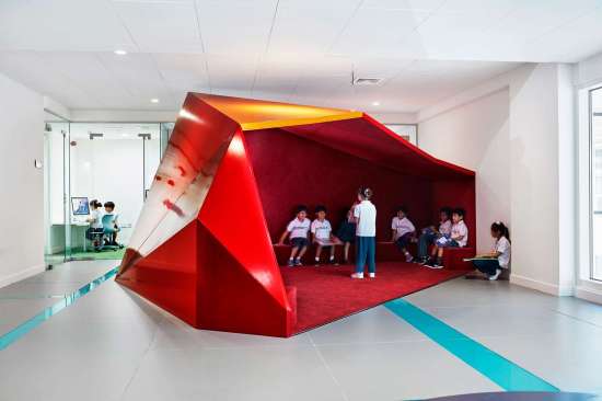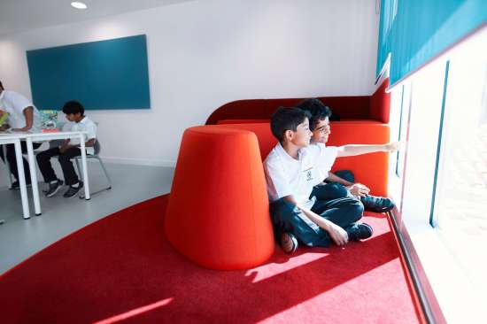 Red sofas sway across all open space of the school. The seatings invite students to meet, hang out, and collaborate on projects, so the entire school is available as learning space.