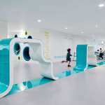 Meanwhile, the giant rock formations surrounding the city work as inspiration for the yellow plateau in the central common area. Here, upholstered caves in the walls give room for immersion, while an oasis of palms and playgrounds invite to movement.