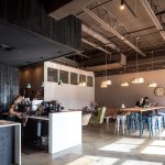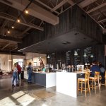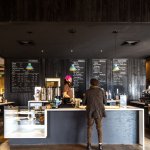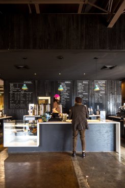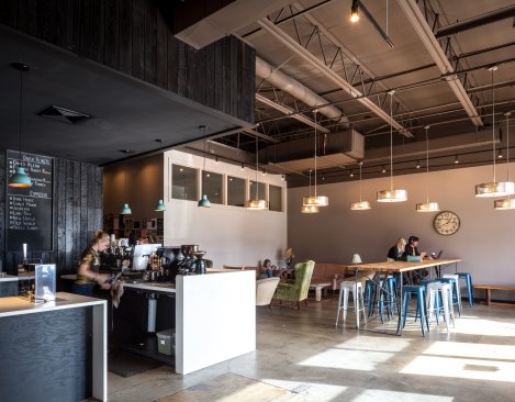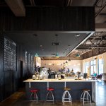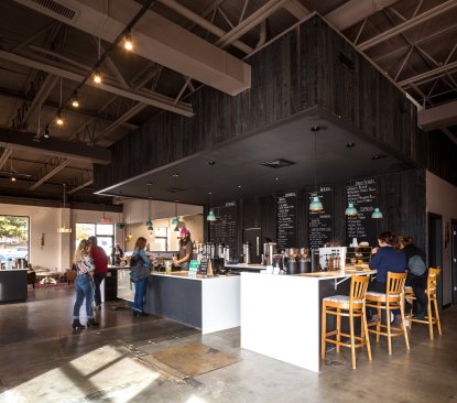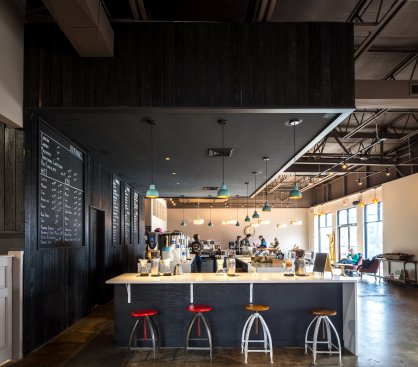 While doubling the floor space of this Charlottesville landmark, the design team wanted to ensure they weren’t changing the existing character – rather, they chose to ground the renovation in its already unique personality. The existing coffee house lacked enough production utility for the growing business, so the goal of the renovation was to transform the space into a central packaging and production facility, while maintaining full coffee service that the community expected. The main challenge overcome by the design team was the need to respect an establishment and its customers that have been a part of the community for years, while bringing a fresh aesthetic and a streamlined flow to its space. Right away, the coffee bar was re-located and re-imagined. The pour-over bar, espresso bar, drip coffee bar, and the front pastry/nitro bar are centered as individual islands under an overhang of charred wood, treated with a Japanese technique called Sho Sugi Ban. The industrial warehouse atmosphere, revealed as a result of removing the drop ceiling, is softened with the existing comfy chairs or donated ones from loyal customers on one side of the coffee bar, while the team created new bar seats and long community tables for conversation and work on the other. Visible from the seating is the packaging area, and even further back the roasting area, where customers can see exactly how their cup is made, and how Shenandoah Joe distributes its product all over Virginia. Tucked behind the front of house, Shenandoah Joe has a “cupping” room, available for groups to taste and learn about new and unique roasts. The end result is a transparent yet efficient production facility, feeding into a bar and public gathering space that successfully blends existing DIY aesthetic and thoughtful contemporary elements.