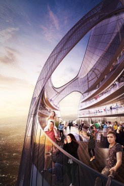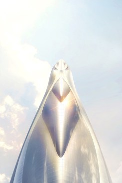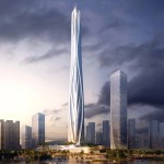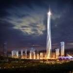 The new tower is located at the center of AS+GG’s Shimao Shenzhen Longgang Master Plan and is the main focal point for every office and apartment building within the development. It is envisioned as one of the tallest towers in the world, at approximately 700 meters, and will serve as a symbolic icon for the new district. In the evenings, the tower itself will be a visual, sound, and light show, reinforcing the district’s athletic and entertainment purposes. The tower’s top has one of the world’s highest observation experiences and additional club facilities that include a restaurant, a night club, spa services, and a grand swimming pool, all with views of Shenzhen and beyond.