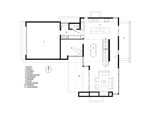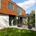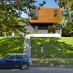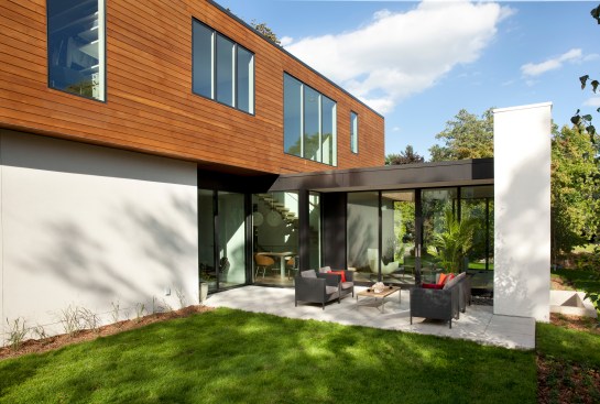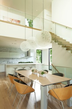 Challenged to design a modern home that wouldn’t be out of place in the established urban neighborhood, the designers envisioned a simple, yet sophisticated solution of three overlapping forms. Tying together the program, materials, and plan of the house, this simple diagram creates a dynamic design and a series of unique exterior spaces. The ‘L’ shaped plan takes the typical, small urban back yard and morphs it into a courtyard open to the south and defined by the two boxes of the main level. Main-level public spaces are spread the breadth of the site and are clad in dark metal. With floor-to-ceiling windows on the east and west, these spaces provide ample views to both the front and the back of the house. Private spaces are placed atop the lower form, rendered in cedar and cantilevered with hidden steel beams to create a front porch. White stucco along the north edge of the lot clads the garage. In addition to maximizing the outdoor space and reducing hardcover, the design creates a strong connection between the exterior and the interior of the home. Inside, the interiors reflect the refinement and materials of the exterior architecture. The floor plan is open, yet each space is defined with its own sense of place. At the intersection of the main level and upper level masses, a two-story dining room with second-level, south-facing windows allows abundant natural light deep into the home. A wood, steel, and glass open stair adds a unique piece of art to this dramatic, double-height space. Dramatic floor-to-ceiling windows fill the home with natural light and views of the four seasons.