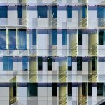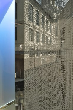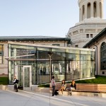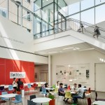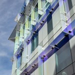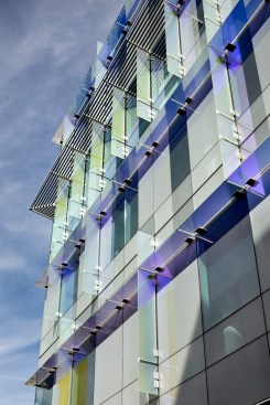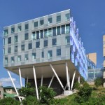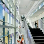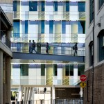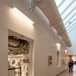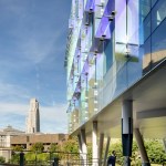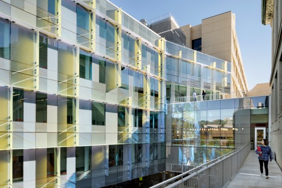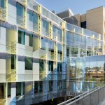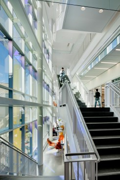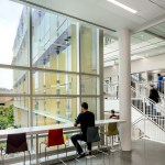Scott Hall’s two interlocking forms embrace at their overlap creating a new hub for the College of Engineering. The Collaboratory, as it is known, links all four levels of the new building and makes direct accessible connections to seven different floor levels in the existing adjacent buildings. Anchored by a café, and framing spectacular views out to city beyond, the Collaboratory is the social and interactive heart of the building, bringing together all the disciplines in Scott Hall and the neighboring buildings. Natural light and framed viewed wash through the space from a high-performance curtainwall whose details draw metaphorically from the science taking place within the building. Sunshades on the building’s south and west facades, fabricated from dichroic glass, a material derived from nanotechnology, increase solar performance and create an everchanging array of colors and reflections with the sun’s movement. Multiple densities of ceramic frit reinterpret the geometry of a photonic quasicrystal creating bands of shade, pattern, and light. At the energy level, solar studies, thermal comfort analysis, and energy modelling informed the optimal arrangement of façade elements based upon loads and performance criteria. At the campus level, Scott Hall’s facades reflect careful study of the neighboring buildings and work to contextualize the design while also creating a bird-friendly façade.