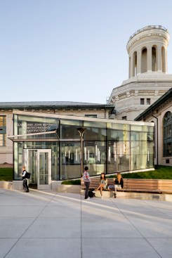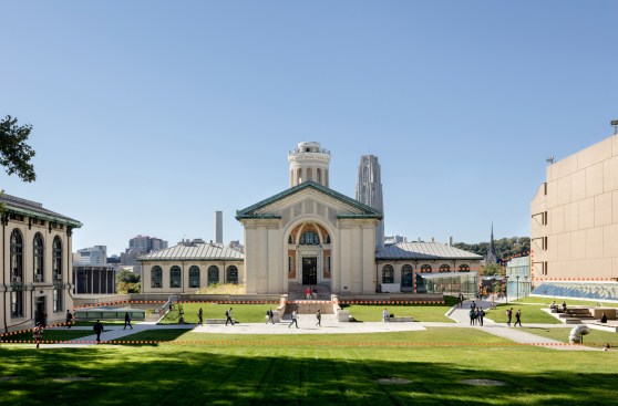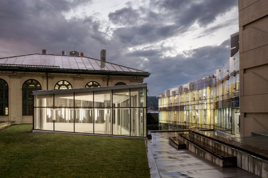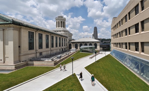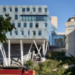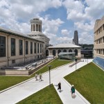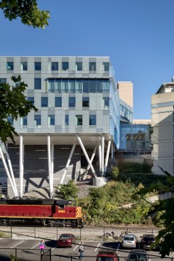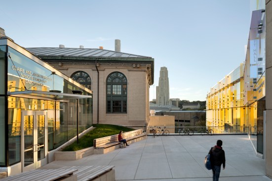 Centrally located between four existing engineering and science buildings, Scott Hall creates a vital and interconnected hub for the College of Engineering. The building’s challenging interstitial site spans from the refined landscape of the Hornbostel Mall down into a neighboring ravine and a steep hillside bisected by a service road and major campus utilities, and bordered by an active freight rail line. The site inspired a design composed of two inverted and interlocking forms that create a coherent architectural composition: the above-ground North Wing with gracefully sloped columns that accommodate the utilities in the hillside below, and the Bertucci Nanotechnology Wing, a below-grade, low-vibration lab space inserted into a sunken service court that previously interrupted the west end of the Hornbostel Mall. The roof of the Bertucci Wing, a new 35,000 square-foot state-of-the-art green-roof, accommodates walkways, plazas, skylights and two glazed entry pavilions that extend the mall landscape, creating a new interconnected and pedestrian-friendly area of campus.