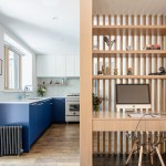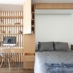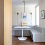 The existing apartment was divided into two main areas – a large, sun lit living room was open and expansive with exquisite historical details. The rear of the apartment had been renovated in the early 1990s and was a series of small, adhoc rooms in a meandering layout. Our renovation respectfully refinished the historic details of the front living area, while the rear of the apartment was gutted, removing the small confining rooms to create a large open, light filled space. A custom cabinet defines the main space and acts as a Swiss Army knife, folding out different types of utilities. A white oak vertical screen provides privacy from the kitchen but offers natural daylight throughout the apartment. A built-in desk with floating shelves is essential for the office; a clean minimal panel pulls down and stores away a comfortable queen size bed with storage flanking each side. Integrated lighting throughout with thoughtful details. A small banquette next to the large wood windows creates a cozy dining environment with additional trunk storage below. The kitchen and bathrooms were renovated with a refined clean palette and storage in mind.
