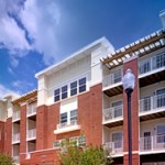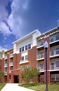 The brick exterior of the building compliments the existing context of the rowhomes in the surrounding neighborhood. A small welcoming courtyard is located on the entry side of the building. Balconies and a deep overhang add depth and interest to the facade.