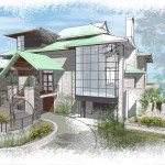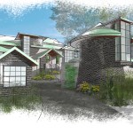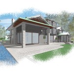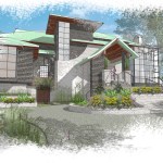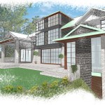 This estate home perches itself on an ocean bluff surrounded by lush Oaks and sub-tropical brush. Greeted by a carriage house at the gate, the elevated home allows for a grand entrance and a mix of traditional shingle shake siding and brick in a modern color pallet. Tall glazed walls allow the main living space to view forward while the rear of the space has oversized pocked glass walls that slide open onto a screened area and pool deck. A large kitchen with catering space is connected by a formal dining area to the great room for endless entertaining space. A secluded main floor master suite captures views toward the water, while a private office perches over the drive to welcome guests. A mix of dark shake shingles, light brick, and copper roofs mix up the traditional material pallet into a modern beach retreat.