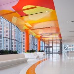 A number of firms formed a unified design team in the development of the project’s graphics and wayfinding program. Communicating the facility’s values and mission throughout the physical space, and contributing to the healing process, the graphics create discrete environments for each lab. Together they uplift the spirit while motivating patients during their recovery and rehabilitation. Ceiling graphics, found throughout the building and its entryway and 10th-floor Sky Lobby, echo its identity.