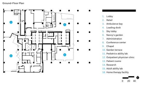 The last of these was the most essential: Flowing and intricate in plan, and bright and colorful in expression, the space lacks most of the typical institutional trappings—the double-loaded corridors, the spinach-green walls—of the healthcare industry, and includes multiple features aimed at improving the experience of all users. For workers, the plan fulfills the lab’s double mandate by affording both secluded “back stage” spaces for study and dialogue, as well as exposed “front stage” spaces for monitoring and interacting with patients. Patients, in turn, can enjoy the swirling decorative schemes that run across the walls and continue onto the ceilings, ensuring that even those on gurneys and hospital beds can still enjoy the view. Double-height windows look out onto a lushly landscaped roof terrace or the city beyond—a rare connection to an outside world from which the chronically ill are so often made to feel cut off.