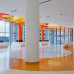 Lighting: a-light (ground-level entry); 3G Lighting (lobby, sky lobby); Kurt Versen (lens wall washers); Selux (recessed linar fluorescent, pediatric lab); Lumenpulse (recessed wall washers); Traxon (cove lights); Eureka (auditorium light fixture)