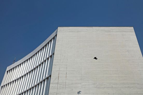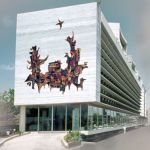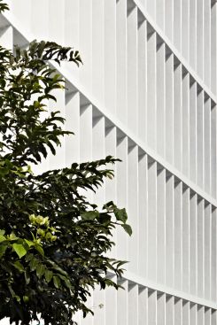 The towers have blank alternating edges, in smooth marble cladding, while the remaining three are louvered. The vertical fins marked by sharp light and shadow develop a changing pattern that aligns with the most important north-south arterial road of the city. The verticality of the five towers is intercepted by another horizontally louvered geometry. The southernmost edge of this base structure is marked by an abstract mural that again signals a modern approach to not only the design of this complex but the very conceptualisation of the programme for Shivsagar Estate itself. The hexagonal plan results in maximum utilisation of space as maximum usable area is created.