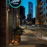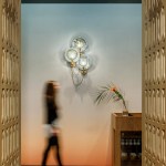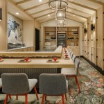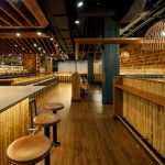 Secluded at the end of a back hallway inside Shore Leave, No Relation is a nine-seat, omakase-style sushi restaurant serving freshly-prepared, globally sourced fish. Owned and operated by Traveler Street Hospitality, it is the only restaurant in Boston dedicated exclusively to this type of traditional Japanese cuisine. The ‘restaurant within a restaurant’ operates autonomously from the tiki bar/restaurant, offering a calmer, intimate dining experience than its counterpart. Pared down materials, such as light wood walls, a white, Japanese cypress sushi counter, and hand-painted tiles orient focus to the relationship between guest and chef as multi-course meals are prepared and served. Commissioned art by artist Mark Grundig includes a painted, magnetic map of the world above the sushi bar used to indicate fish sourcing and a vibrant interpretation of Japanese cherry blossoms that acts as an artful floor treatment.
