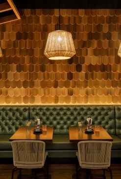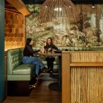 Shore Leave is a tiki bar and restaurant in Boston’s South End. Owned and operated by Traveler Street Hospitality, the ‘subterranean oasis’ is located about 20 feet below street level and serves as a destination for guests to escape and enjoy. The design team drew inspiration from America’s tiki culture, a motif that stretches beyond stone and wooden figures to include a highly considered selection of tropical and mid-century modern elements. This influence was threaded through the space’s design, taking care to be cheeky and not irreverent. The space includes communal booths, private tables, and three bars, seating about 100 guests. At the center, a dining area is partially enclosed by nautical ropes, allowing it to function privately while remaining included in the spirited surroundings. Commissioned art colorizes the space, including a hand-painted mural depicting the owners and management staff by artist Massimo Mongiardo.