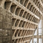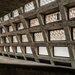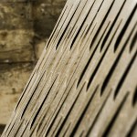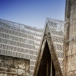 North of the water landscape is the Yulong tower, with a bronze drum on the top. The drum, cast in bronze, is a ritualistic element in Shui culture and inspired the architects to use perforated bronze plates to cover the building. Due to the acidity present in the local air quality, bronze plates are easily subjected to color’s changes and corrosion. Since the particular texture of the bronze has a special meaning in this project, architects used 12 combined processes to overcome corrosion problems, to make the building shining under the sun for longer time. The pattern makes the plates lighter – a thin skin which creates a contrast with the heavy concrete structure – breaking the sunlight to create a dramatic effect once inside. It does not only have an esthetic value but the high perforation rate also helps to prevent technological defects on the overall surface texture.