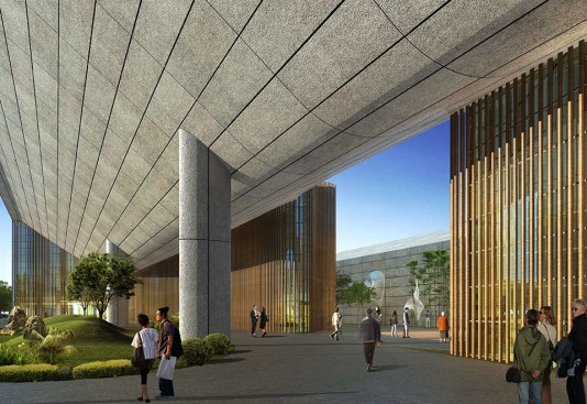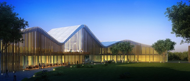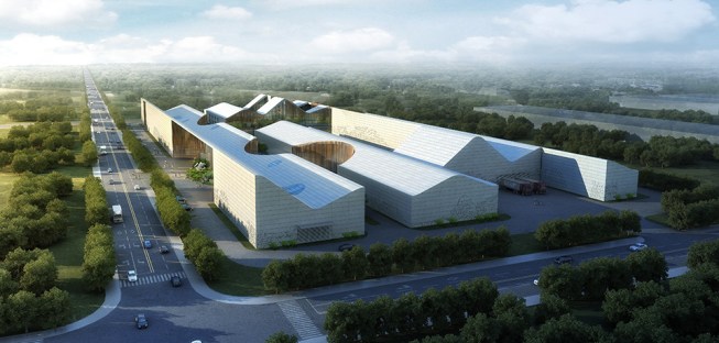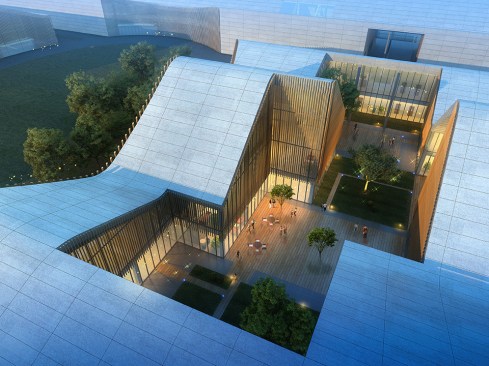 The task for this project for a Chinese private investor was to bring together four different typologies- studios and art production, an innovation, auctioning and event center, a hotel and an exhibition space. We chose a design that unifies the different functions under an undulating roof shape which is inspired by the curved-up eaves of the local traditional architecture.