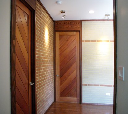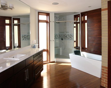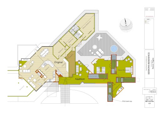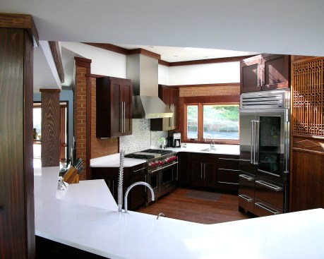 This project was an addition to, and renovation of, a unique home. Designed by an architect who had trained with Frank Lloyd Wright, it is a classic of early modern prairie-style architecture. The design attempts to preserve the integrity of the original building while nearly doubling the space available to the owners. The addition uses the existing style, but contrasts with the predominantly horizontal emphasis of the original by centering the new spaces around four vertical towers. The connection between old and new is made tenuous by a nearly all glass hallway, allowing the original building to read in its entirety. The existing kitchen and dining areas were renovated to alleviate a heavy feeling caused by the unrelievedly low ceilings. By opening up space within an original vertical tower element which served to house skylights, the ceiling height over the kitchen was raised. This contrast with the original ceiling heights emphasized the horizontality of the original while providing a greater sense of space and light.