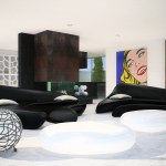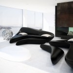 Constructed with open concept inteiors (kitchen, dining-room and living-room plus master-suite, all in the mian floor) and joining rectlinear forms that seemed to float on a cliff, these spaces features spectacular views from every vantage point in the interior. A massive fire place is the only division in this pristine space while maintaining perfect dialog with the futuristic-shaped Moon System sofas designed by Zaha hadid for B & B Italia.A floor-to-celling glass walls expands the conceptual impact of the living-room while offering direct access to the open-air terrace wich features a hanging-pool.