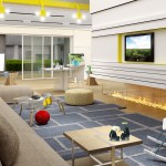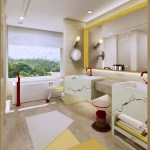 Taking all of these items into consideration, HBA developed interiors that married Sottsass’ exterior architecture. Everything is based on geometrical volumes and touches of color without being overwhelming and blended with the softness required to make this space the wellness center it was intended to be. The balance between hard and soft is studied in every area to avoid the feeling of being in a museum. The walls, for example, are divided in an irregular gridline of shapes, whereas their texture is a warm white stucco. The floors are rhythmed by woolen rugs, designed as geometrical forms. The furniture is an eclectic mix of bold contemporary items, with the right balance of neutrals and colors. Accessories decorate the spaces and add to the casual feeling overall.