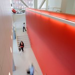 The entrance lobby is conceived of as an interior street linking the activities within the building to the surrounding neighborhood. Community gathering and gallery space at street level further animate the space and invite the public to engage with the School. An auditorium on the second floor is expressed on the facade with a glazed wall allowing views of activity in and outside the building. Classrooms, lecture halls, and laboratories occupy the lower levels with academic departments and offices on upper floors.