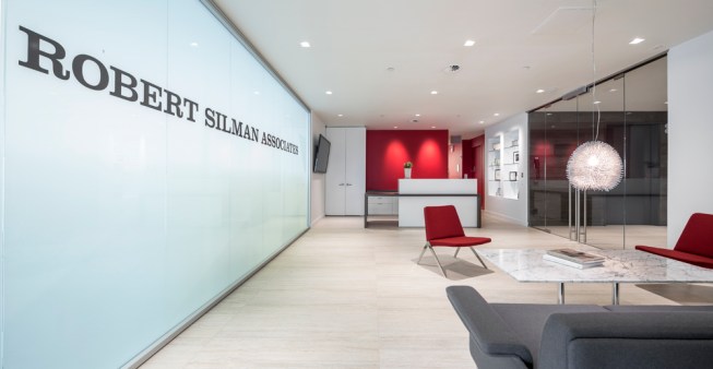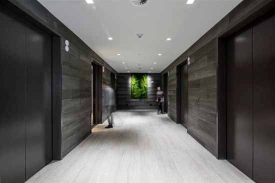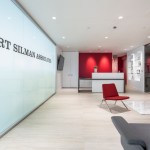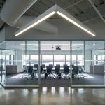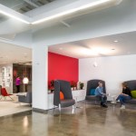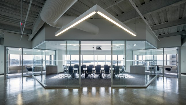 This office design for a prominent engineering firm occupies a full floor plate and includes offices, open work areas, meeting rooms, and common spaces.