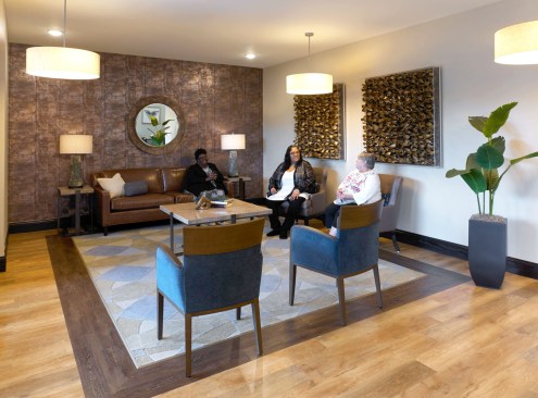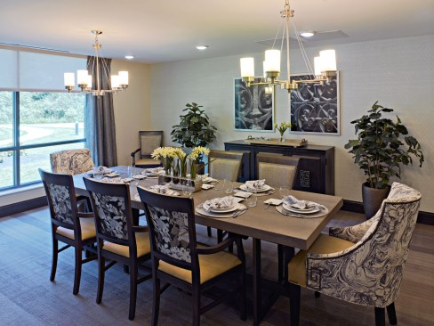 It started with the site. Positioning the building in such a way to create a landscape buffer between a smaller scale residential community to the west and an unknown future development site to the east. Next came texture and subtle color changes on the façade; blending the building into both the suburban and rural fabric of Michigan City, Indiana. Inside, residents and guests are welcomed in by a two-story lobby followed by hotel-like designed amenity spaces including residential lounges, creative and activity rooms, all to cultivate social interactions. Even a wellness suite with salon, fitness center and physical therapy room provide additional community connections. The best feature, is the formal dining room which has open access to a patio overlooking a landscaped courtyard bringing the outside in.