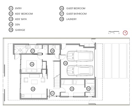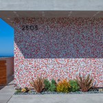 Shimmering glass tile on the building’s bottom level leads to the side entry that is hidden at the street. Inside, the same glass tile continues upstairs along the stair, and contrasts with concrete floors, teak stair and white ceiling. On axis to the entry, the solid, stair leads directly to a framed view to the Channel Island Marina.