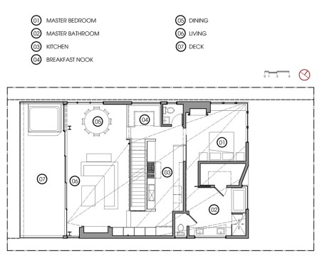 The 2nd floor is an expansive and complex composition of intersecting ceiling planes, framed openings and ocean views. Major formal manipulations are the result of the site’s intersecting views from the Channel Island Marina to the Pacific. The roof and ceiling forms are manipulated to magnify and contrast these views. This primary view-expression cuts diagonally as a continuous ceiling vault. Secondary ceiling expressions direct views to the beach, while shielding from less desirable directions.