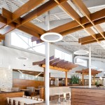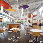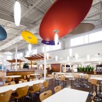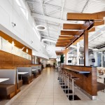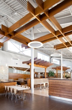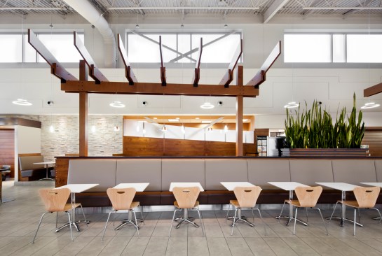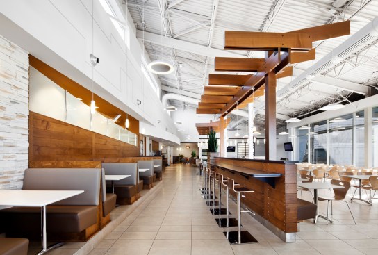 Concerned with the well-being of its 3,500 employees, the company wanted to establish a place for them to eat and relax, while serving the entire industrial complex. The project took shape in a new 15000 sq.ft. pavilion housing a cafeteria that can host up to 225 people, a commercial kitchen and a multipurpose space.
