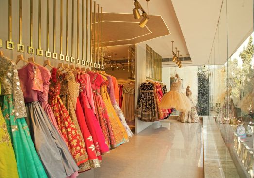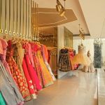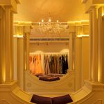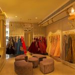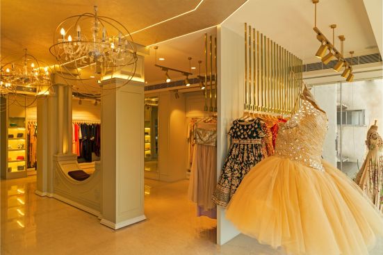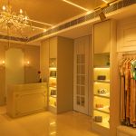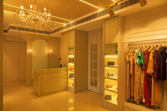 The colour scheme of the space – white and beige, with gold accents reimpose the clean and minimalistic design scheme. The exquisite chandeliers enclosed in a gold spiral casing, and the architectural lamps are stand-out features at the store. The use of gold for studio lights, golden colour racks and chandeliers add that extra edge of extravagance to the space.