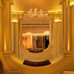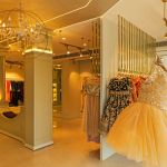 Through the arched entry-way, one’s eyes are immediately pulled towards the crystal bevelled ballerina, suspended from the ceiling, ahead of a glass façade; a unique take on the window display. The absence of mannequins in the display and boutique allow the garments to be highlighted in their true form.