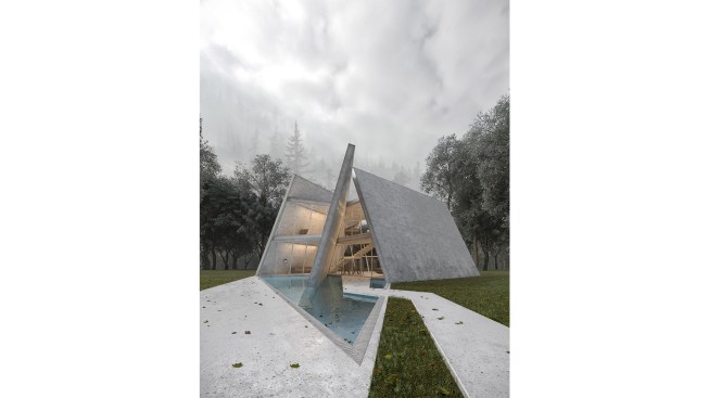 the neighboring views are blocked and the north-south view opens, the site and the landscape are also penetrate the project. Subsequently, inspired by native architecture and morphological studies of sloping roof, the walls of the project in the z-dimensional angle are rotated consequently, walls & roof converted to each other, resulting in architecture and structure becoming one. The structure is a sloping concrete shear wall project with The addition of concrete slabs increases the structural diaphragm behavior.